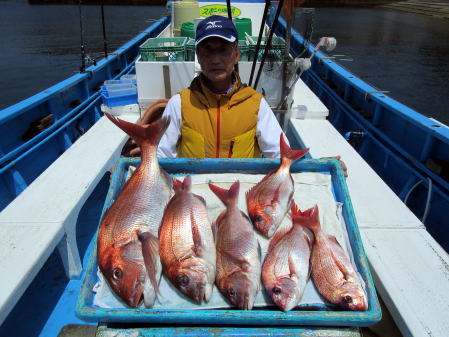 ![]() 8月6日(木) 午前 マダイ3.4k頭に6枚 松下様 |